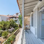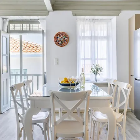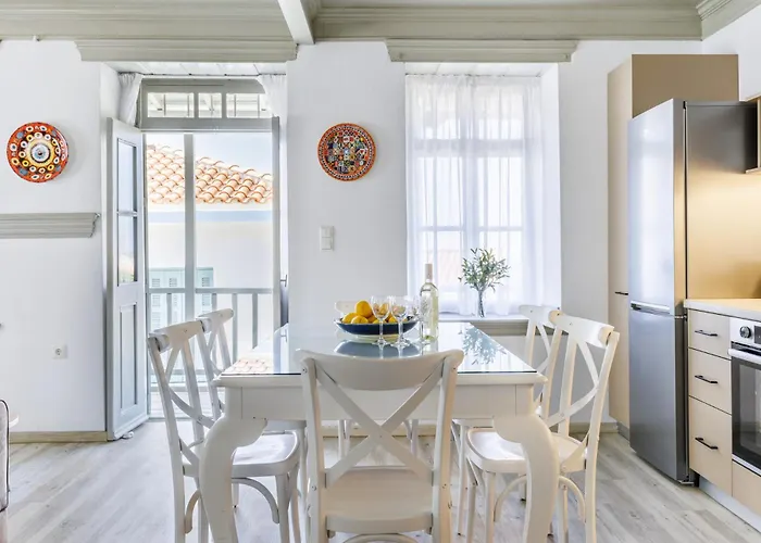 Vila Amorama Suites - Authentic Village Stay In Glossa pune la dispoziția oaspeților o bucătărie utilată, un ceainic electric, aparat de cafea/ceai și un cuptor. Oaspeții vor găsi The Garden la 300 de metri distanță. Cea mai apropiată stație de autobuz este Loutraki, aproape de această casă de vacanță din Glossa.